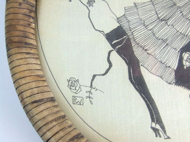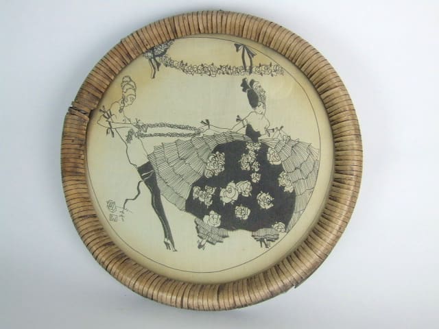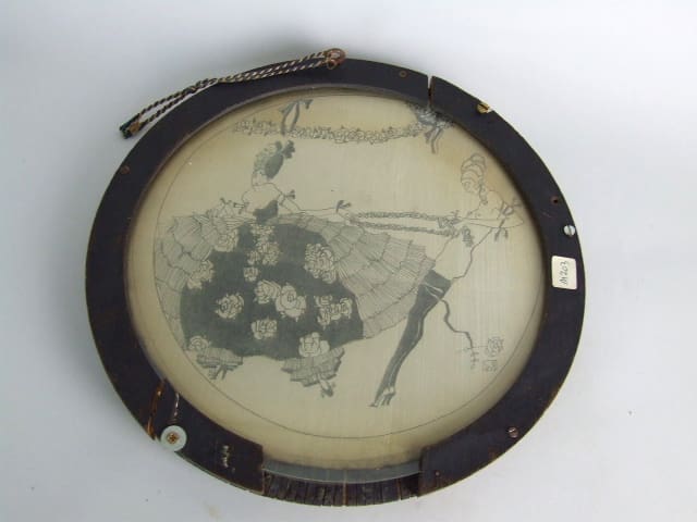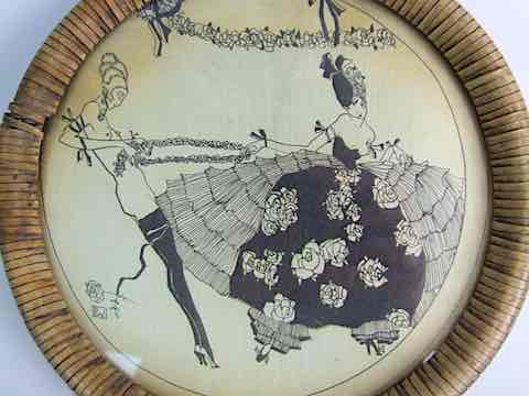 Picture plaque with a silk picture detail sandwiched between two pieces of circular glass with a raffia frame. Signed to the glass. Apparently possibly by Aubrey Beardsley.