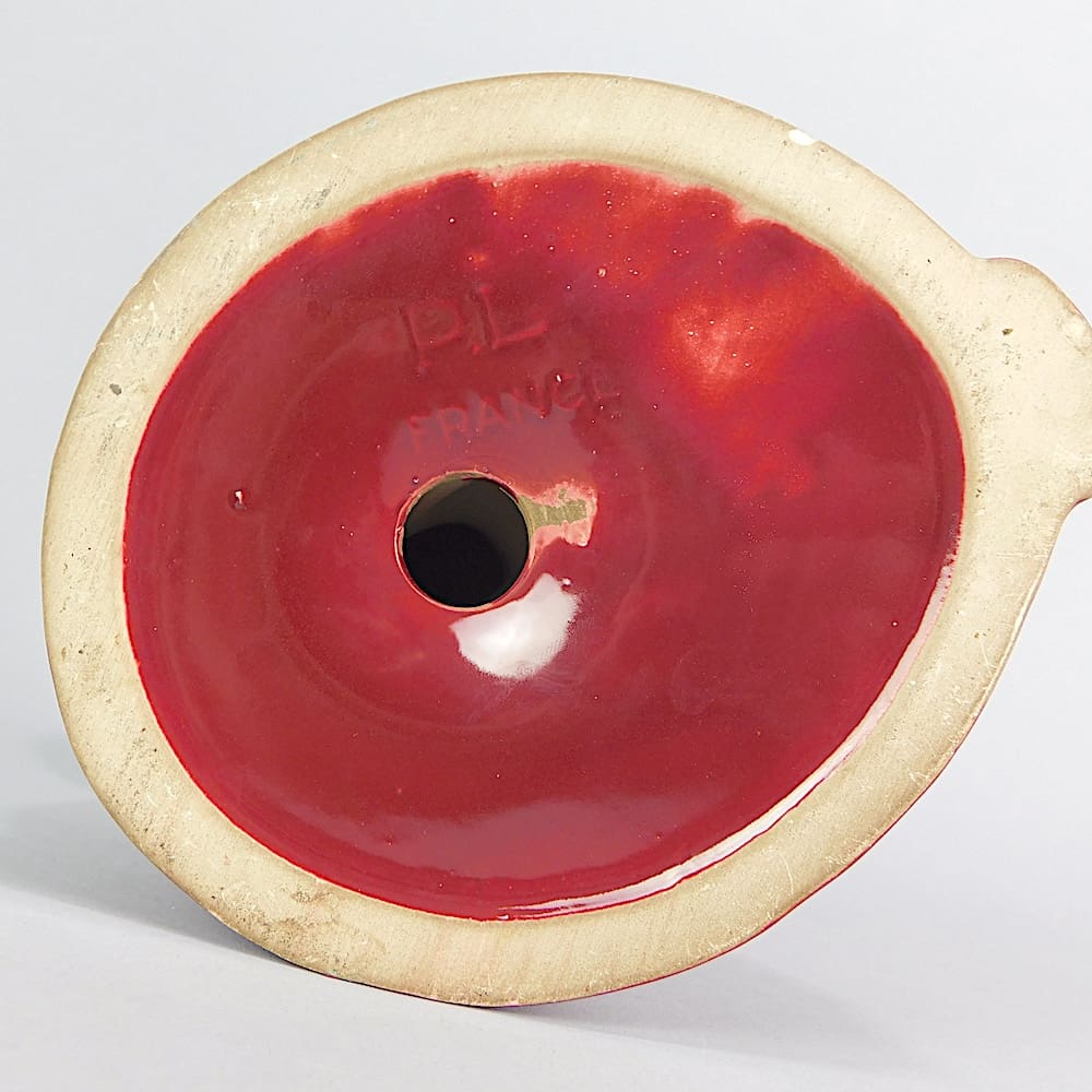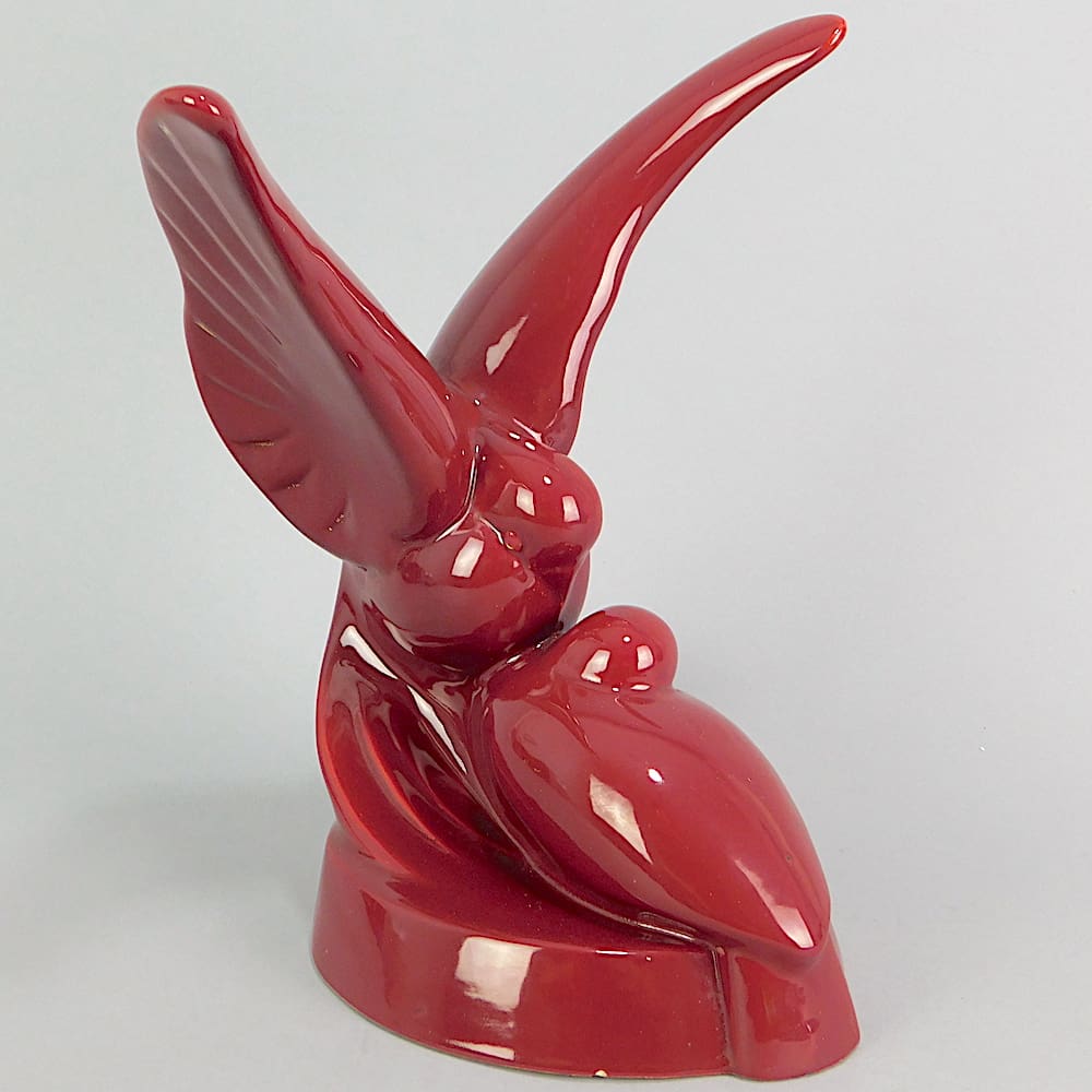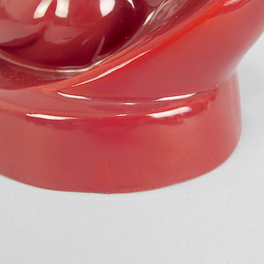Red glazed doves, a French faience piece. Signed Jean.