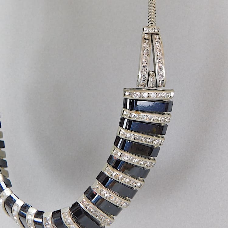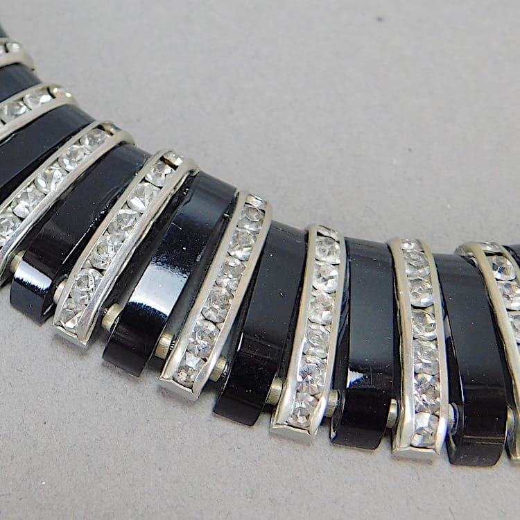 Modernist Art Deco black galalalith and diamonte necklace by Jakob Bengel.