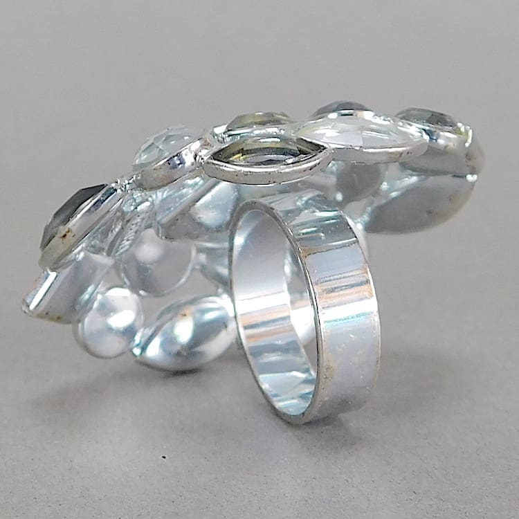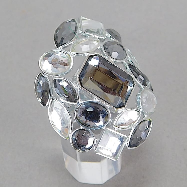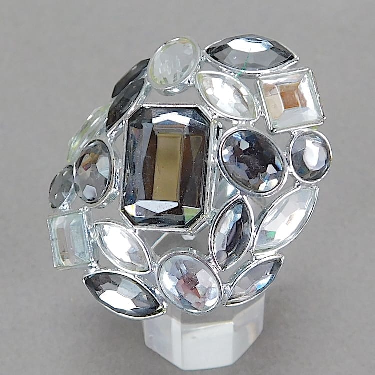 French glitzy ring with clack, clear and grey stones.