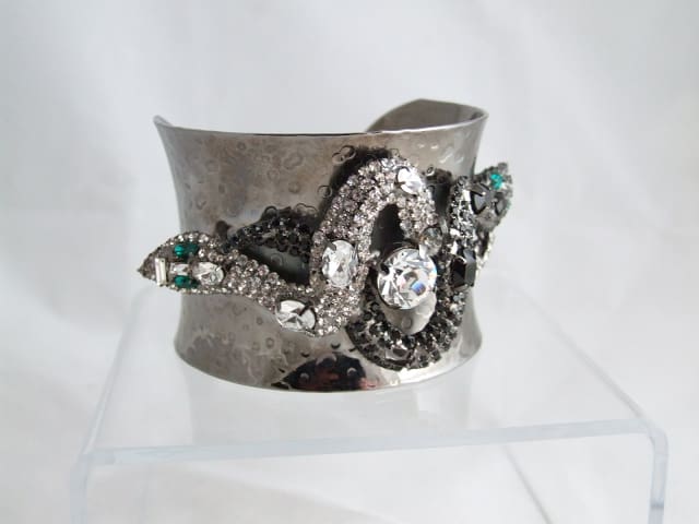 French metal bangle. With diamonte and glass stone snakes, one white and one black intertwined on a gunmetal grey metal band.