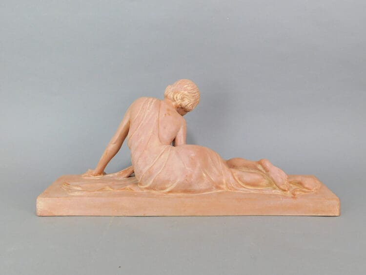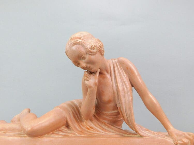 Beautiful French terracotta girl peering downwards, ideal for the higher viewing platform.