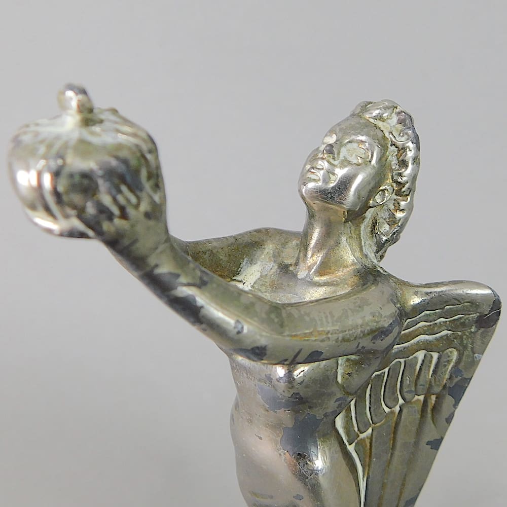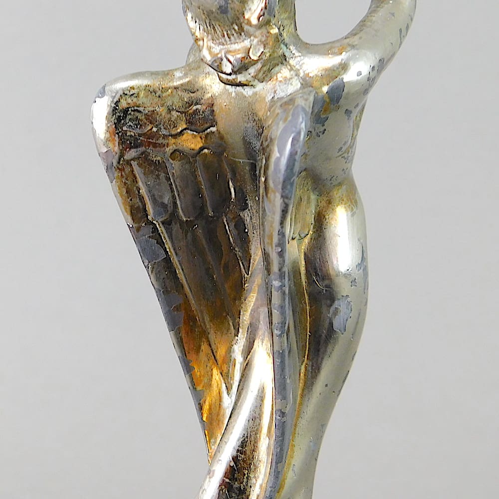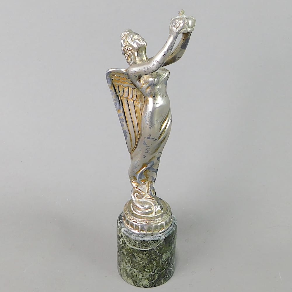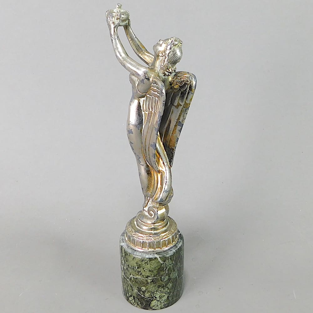 Spelter winged goddess holding a crown car/hood ornament.