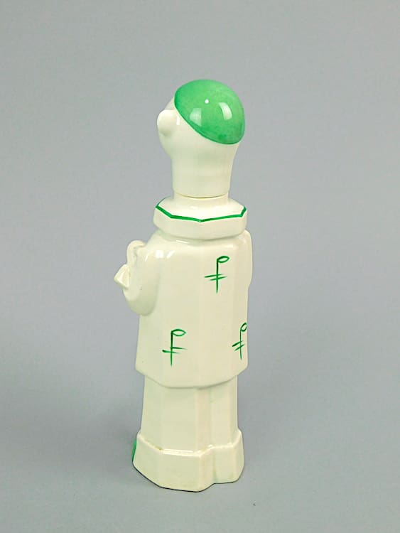 Hand painted ceramic cubist Banjo player liqueur bottle with removable head stopper. Made in the 1930’s by the German company of Goebel and marked under the base with their black stamp and model number 851.