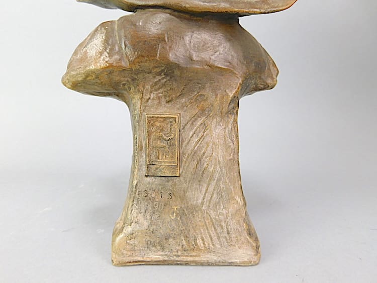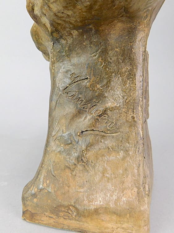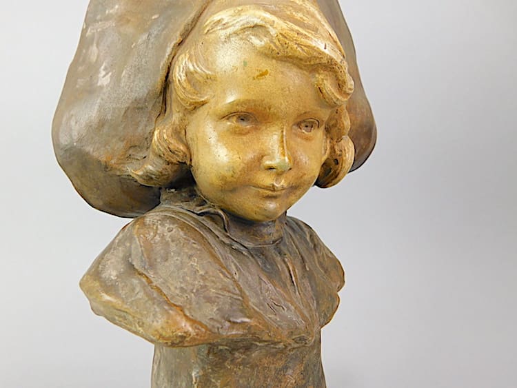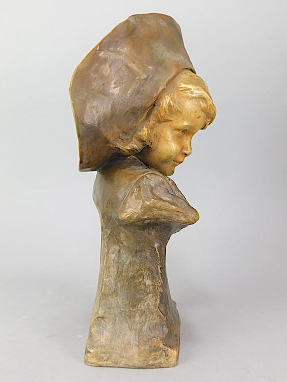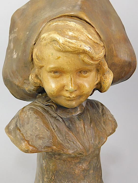 Lovely bust of a young girl with a large hat by the famous Goldscheider factory c. 1905. Signed Vansteen and has the Goldscheider applied mark to the reverse.