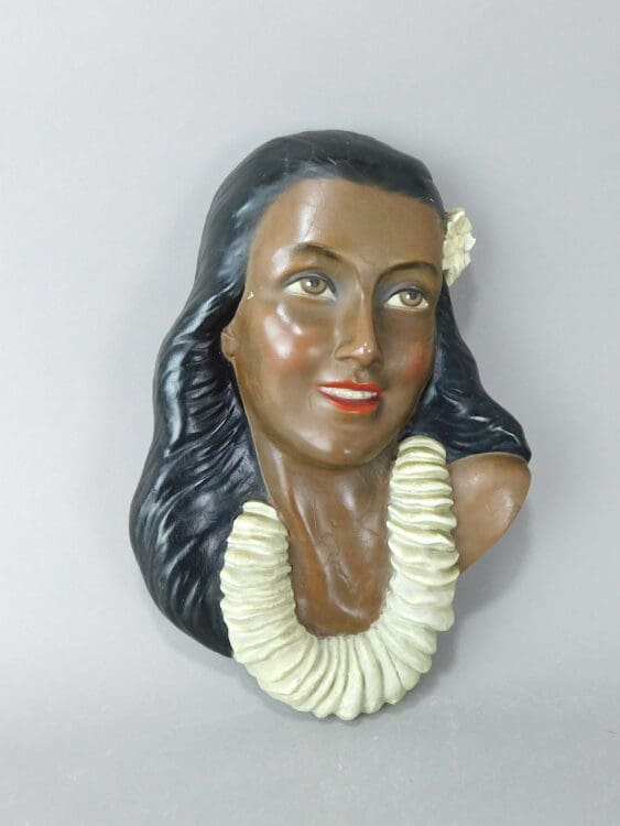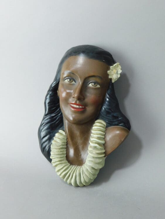 Large wall mask of a Hawaiian girl with a garland around her neck. Early Goldscheider applied mark to rear and number 3217.