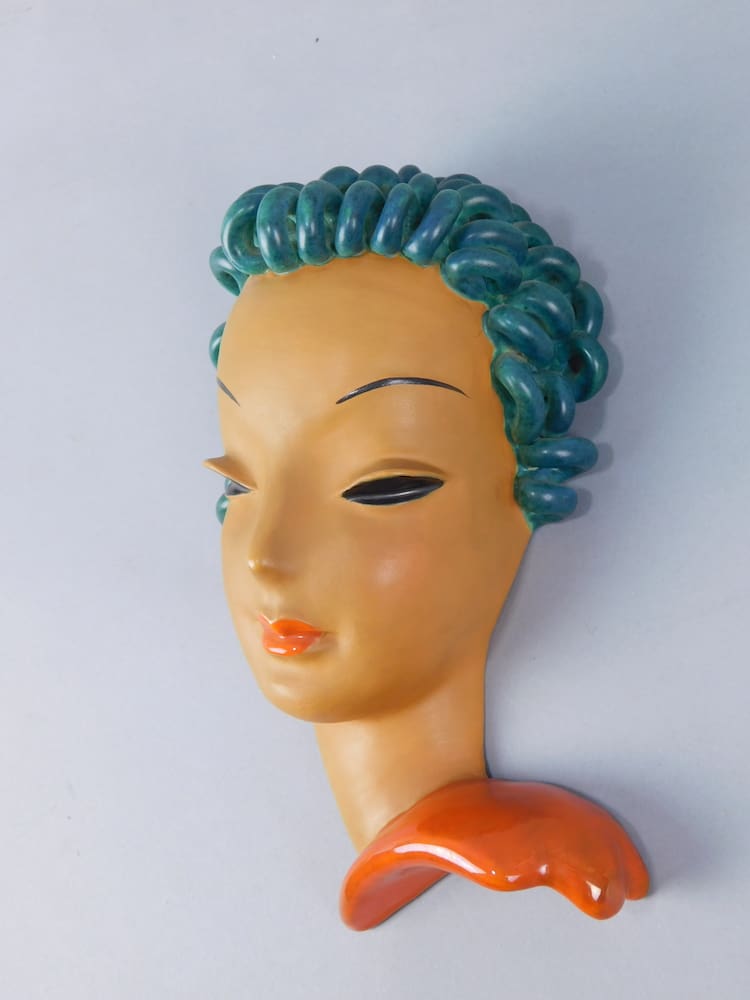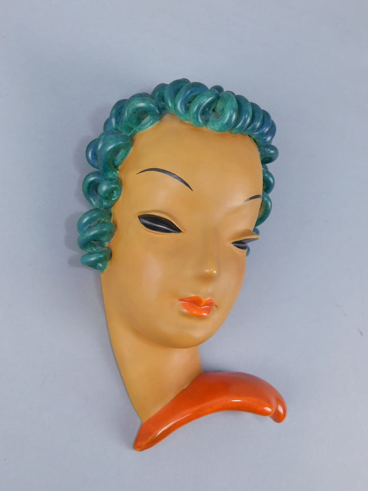 It has green glazed sausage curls and was hand made out of terracotta in the 1930’s and is glazed to the back, and is also stamped to the back – Goldscheider. Designed by Rudolf Knorlein in 1932 for Goldscheider.