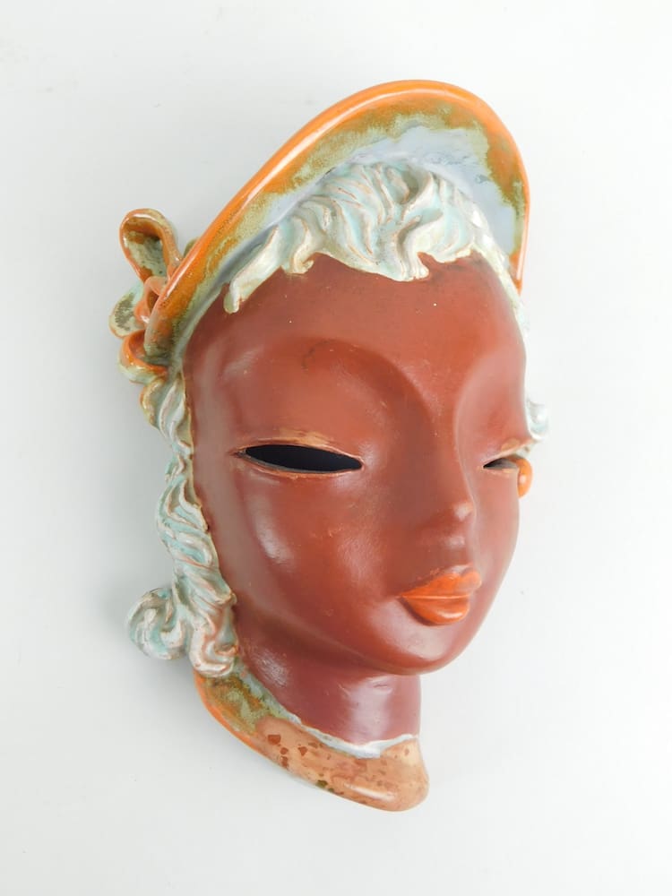 1930’s terracotta mask marked Goldscheider, Wien, Austria and model number 7585. Designed by Kurt Goebel in 1936.