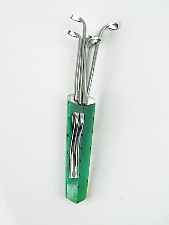 Modernist golf bag brooch by Jakob Bengel, in green galalith and chrome, would make a nice tie clip.