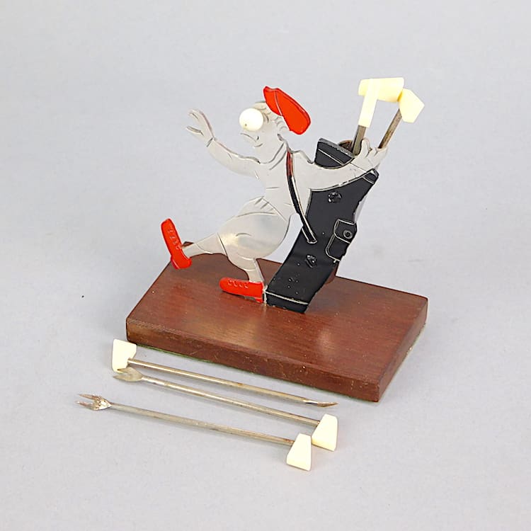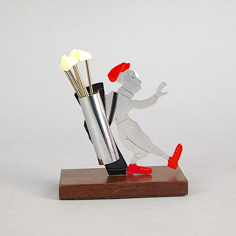 French comical two dimensional golfer who has been in hit in the eye with a golf ball. In his golf bag are 6 golf clubs which are cocktail sticks. Base is rosewood. Hand painted, no makers mark but I believe by Sudre, France.