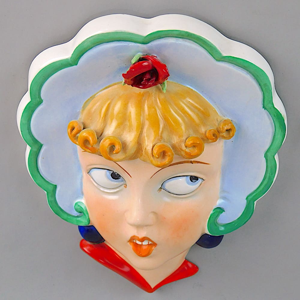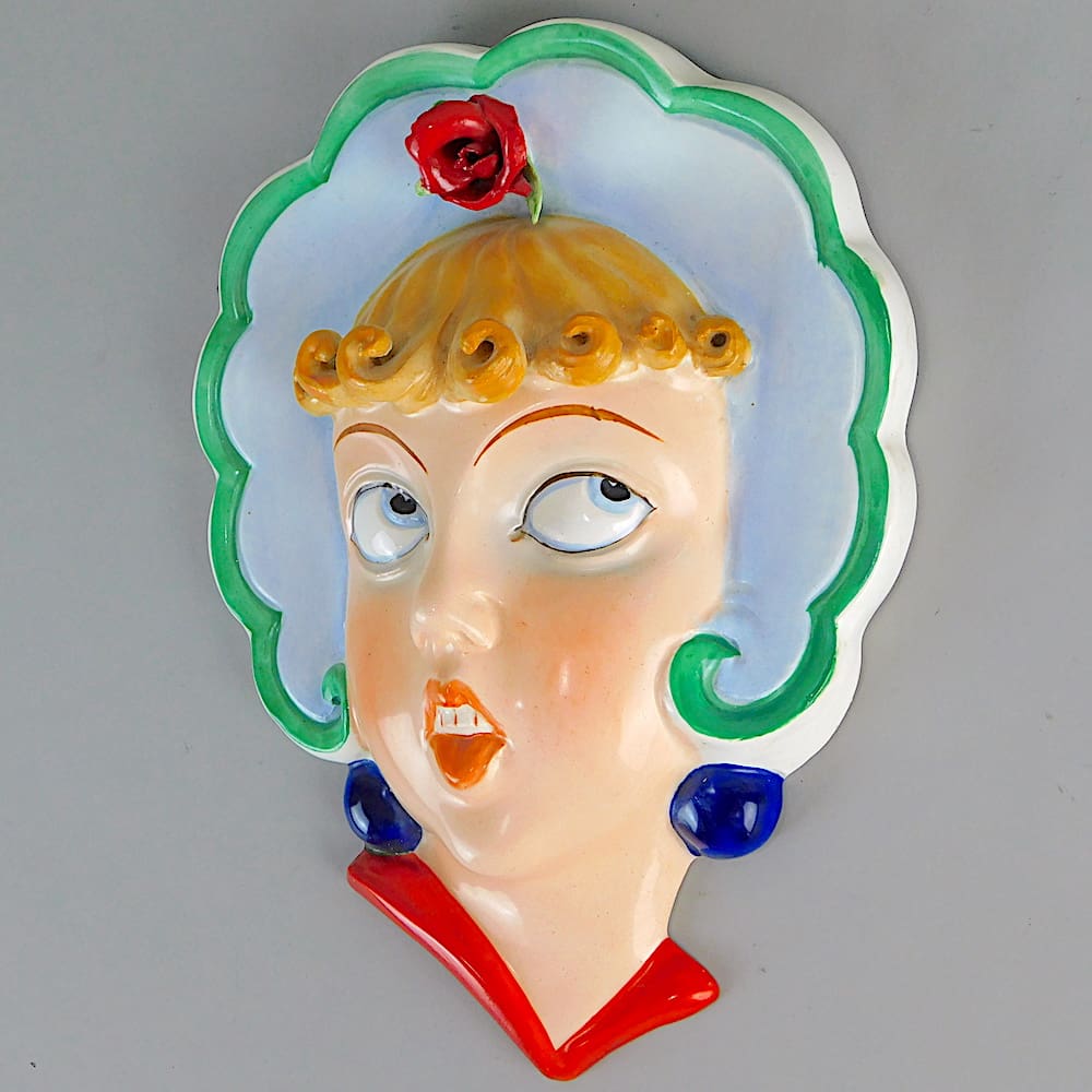 A Czech Art Deco hand painted ceramic Royal Dux (stamped) google eye wall mask with rose detail on her hat.
