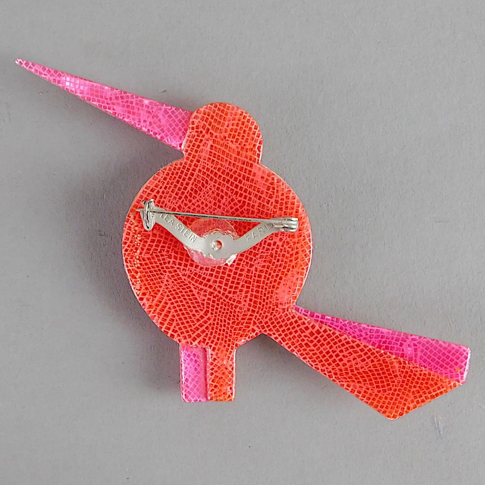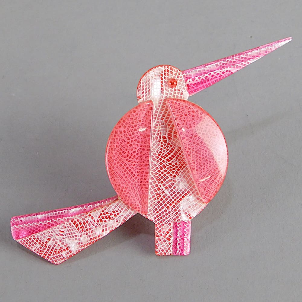 This is a rare first edition Great Beak bird Brooch in pink and purple snake skin effect celluloid.