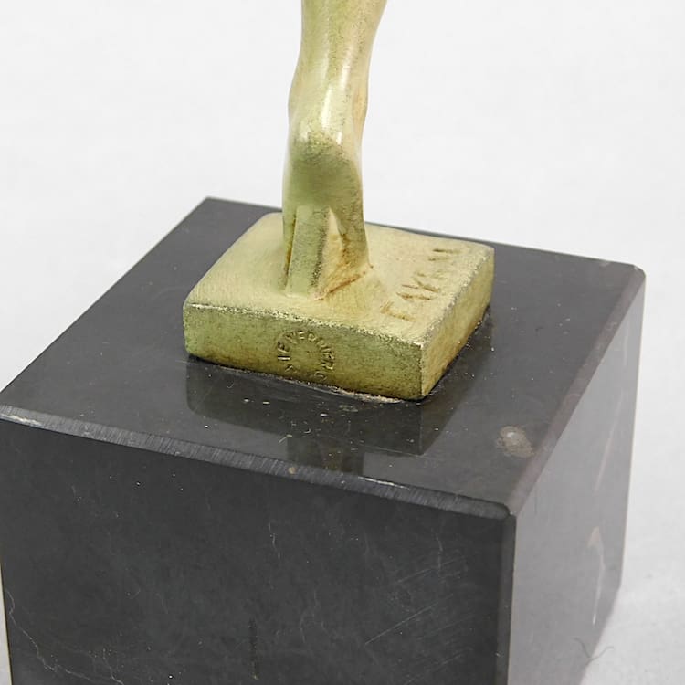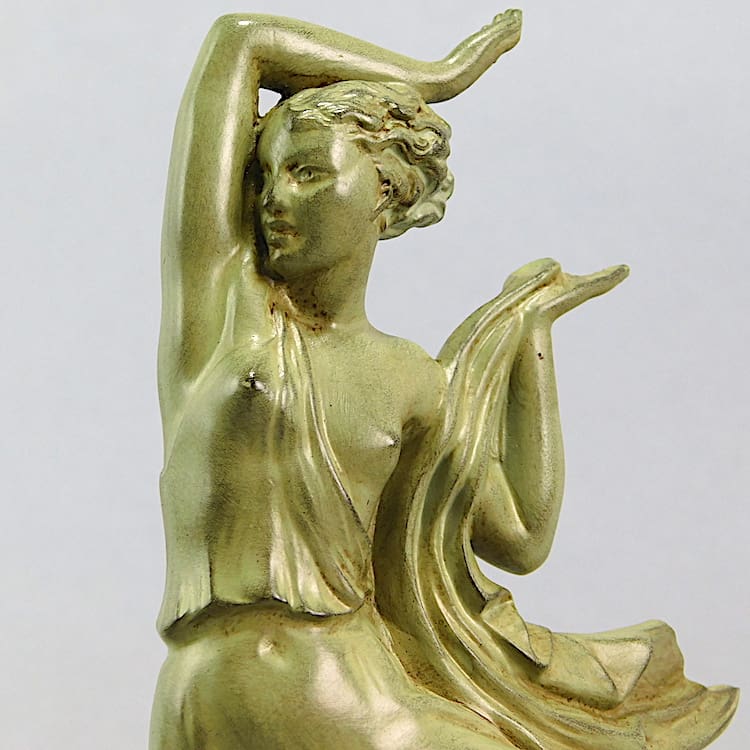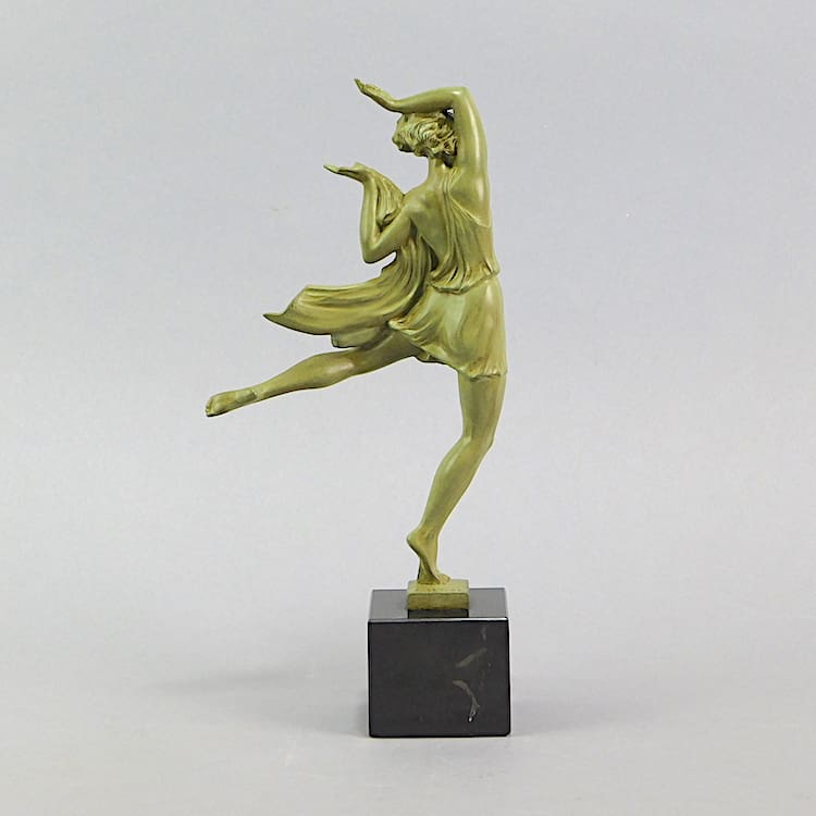 A French green patinated art deco dancer signed by the artist Fayral – a pseudonym for Pierre Le Faguays.