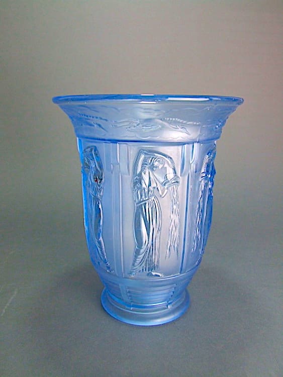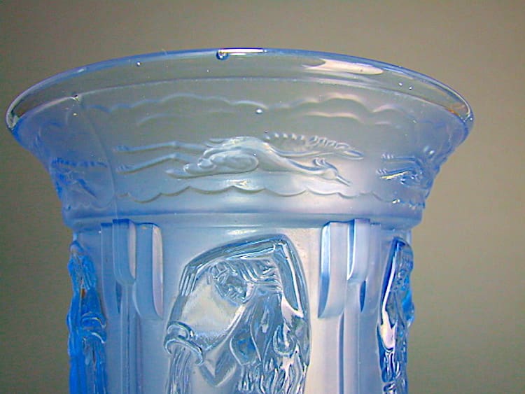 French blue glass vase with with 6 Grecian ladies pouring water on the sides and herons in flight around the top.