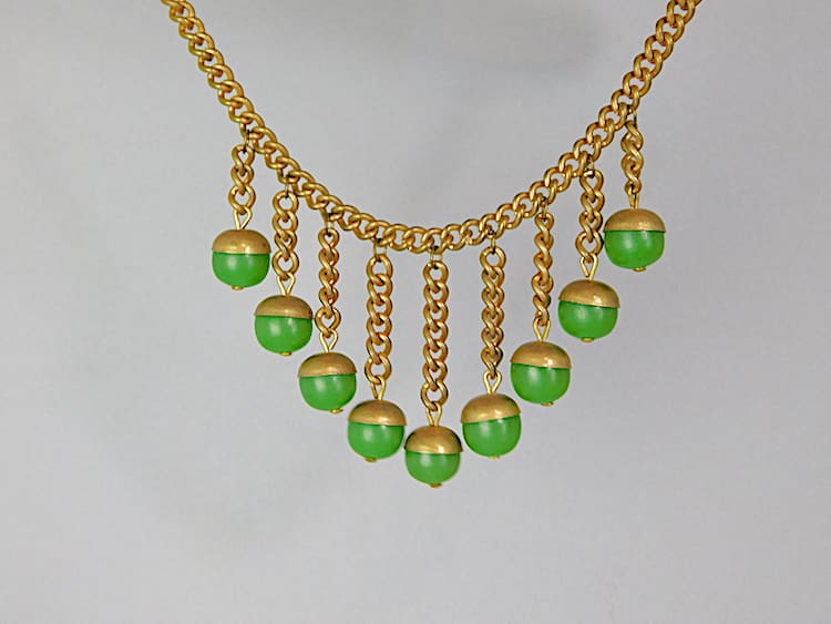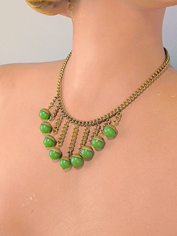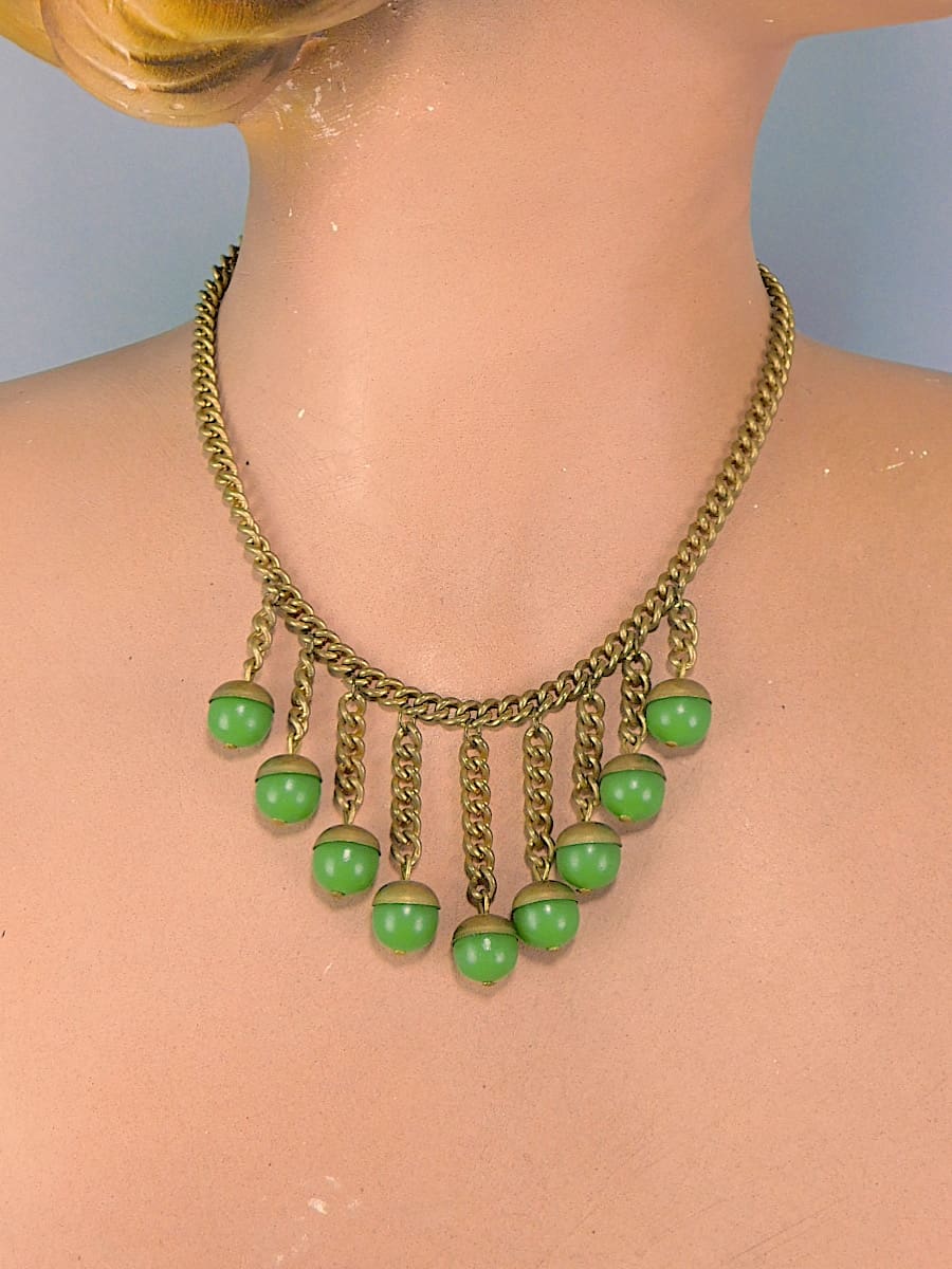 Made in the late 1920’s-early 1930’s, this has a gilt metal chain and fringe with green galalith acorns hanging down.