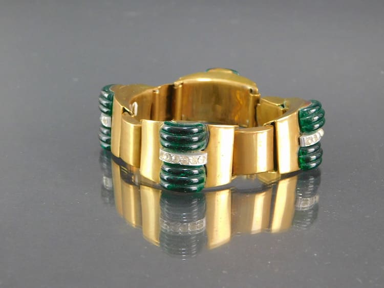 Vintage 1920’s gilt metal chunky bracelet. Central panels are made of ribbed green glass with diamonte bars.