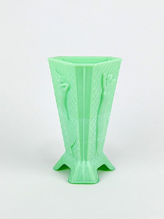 An art deco, 3-sided American vase depicting deco ladies and made of vitrolite.