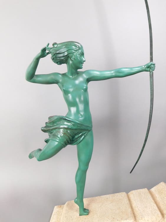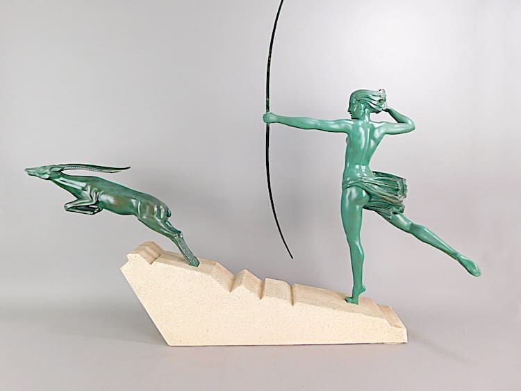 This is the largest version of this group and it is signed De Marco. The female Diane was designed by Marcel Bouraine and sold to the Le Verrier foundry in 1930 and the leaping deer design was by Max Le Verrier. The name De Marco was a name used by Max Le Verrier on statues that were a marriage of artists.