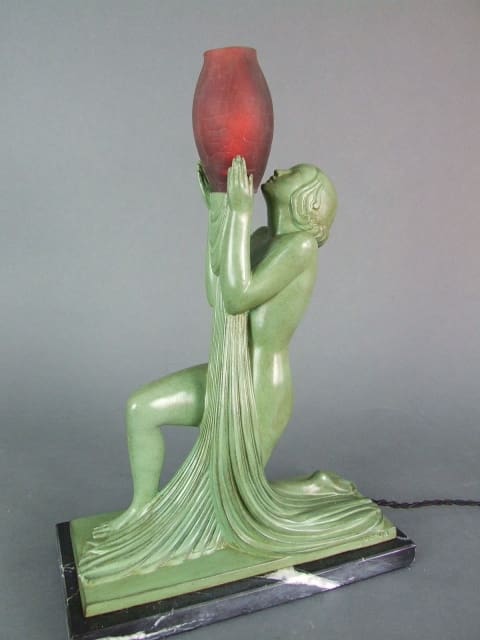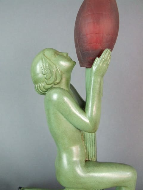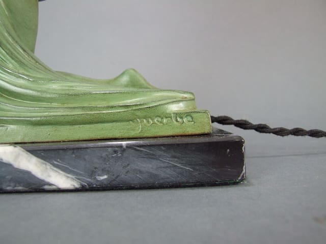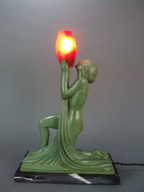 A green patinated spelter lamp mounted on a black marble base with white striations. She is called ‘Adoration’ and is an original Le Verrier piece made in Paris, designed by Raymonde Guerbe Le Faguays but with the benefit of replacement wiring. Signed in the metal.