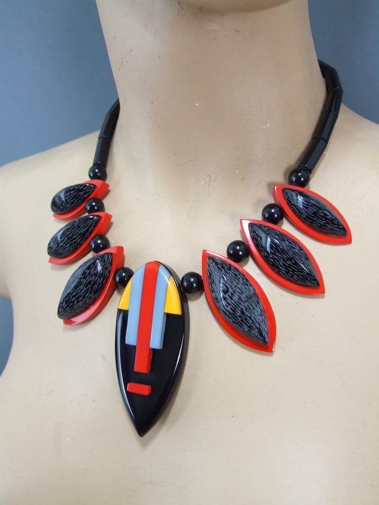 French galalith modernist mask necklace made by Francois Schoenlaub for Guillemette L’Hoir, Paris and signed to the back of the mask pendant.