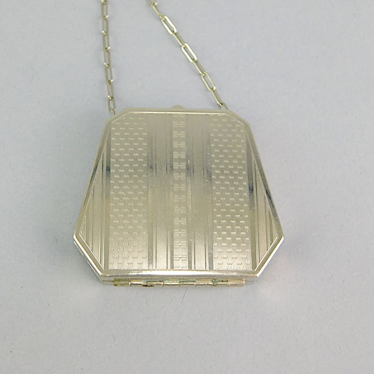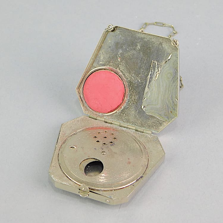 Vintage 1920s engine turned handbag style with chrome strap and to the centre is a panel of guilloche enamel with a hand painted flower. Inside is a section for powder and rouge.