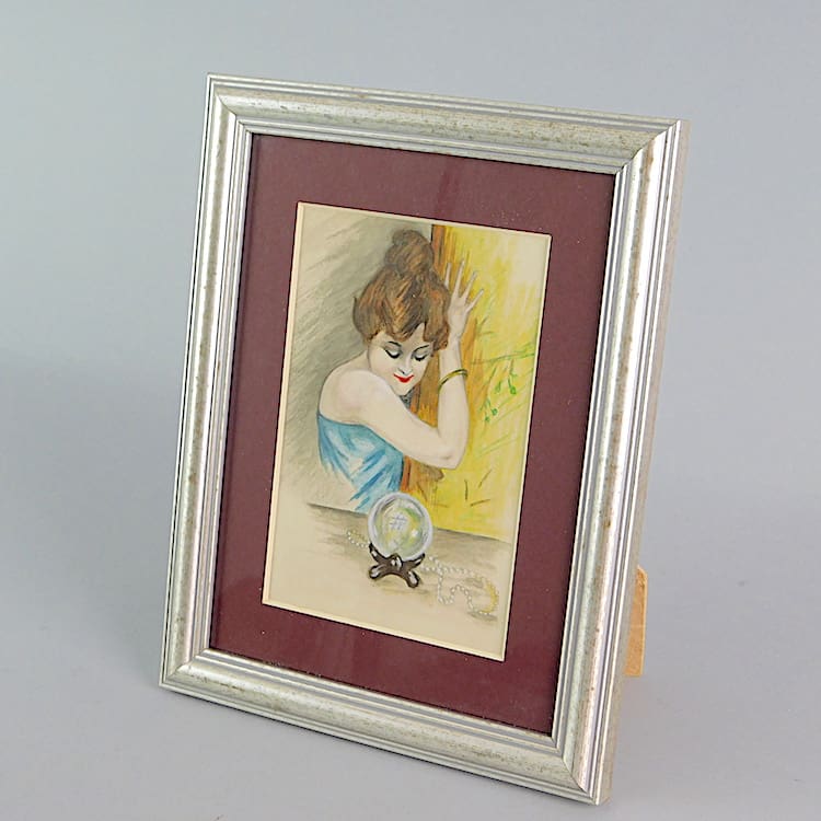 Lovely 1920s original water colour of a gypsy lady with her crystal ball, signed under the frame mount by the artist. Contemporary frame.