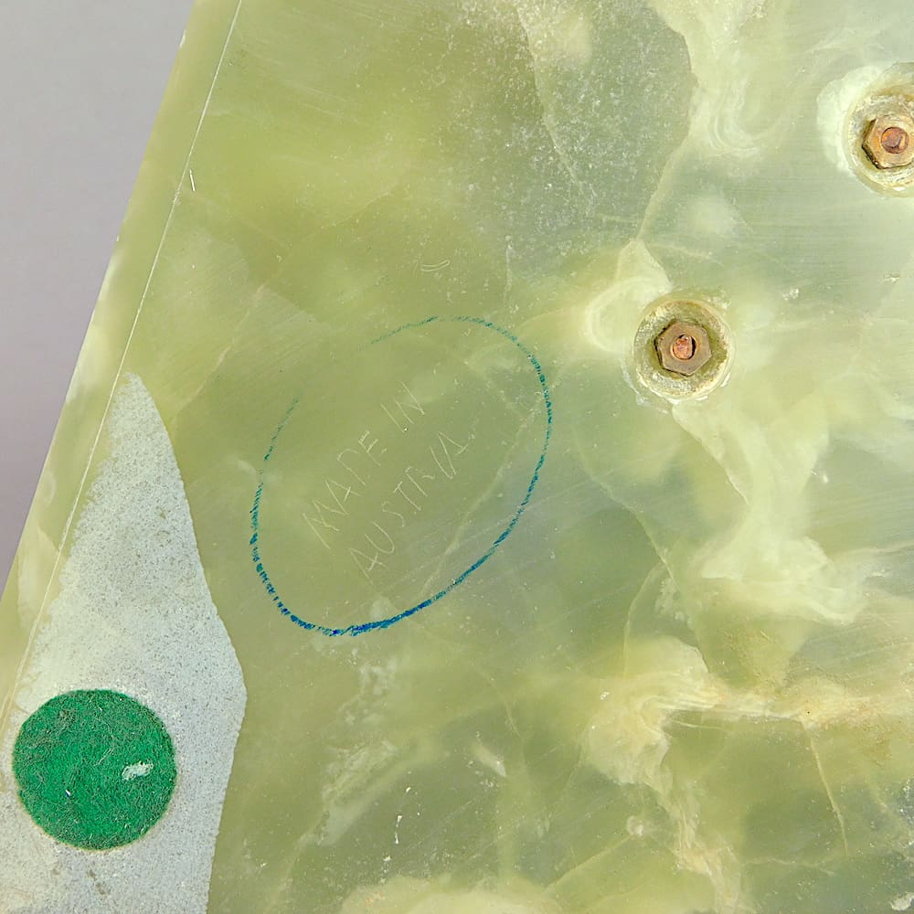 The base is made of green onyx and resembles a triangular carpet with a bronze saxophone.