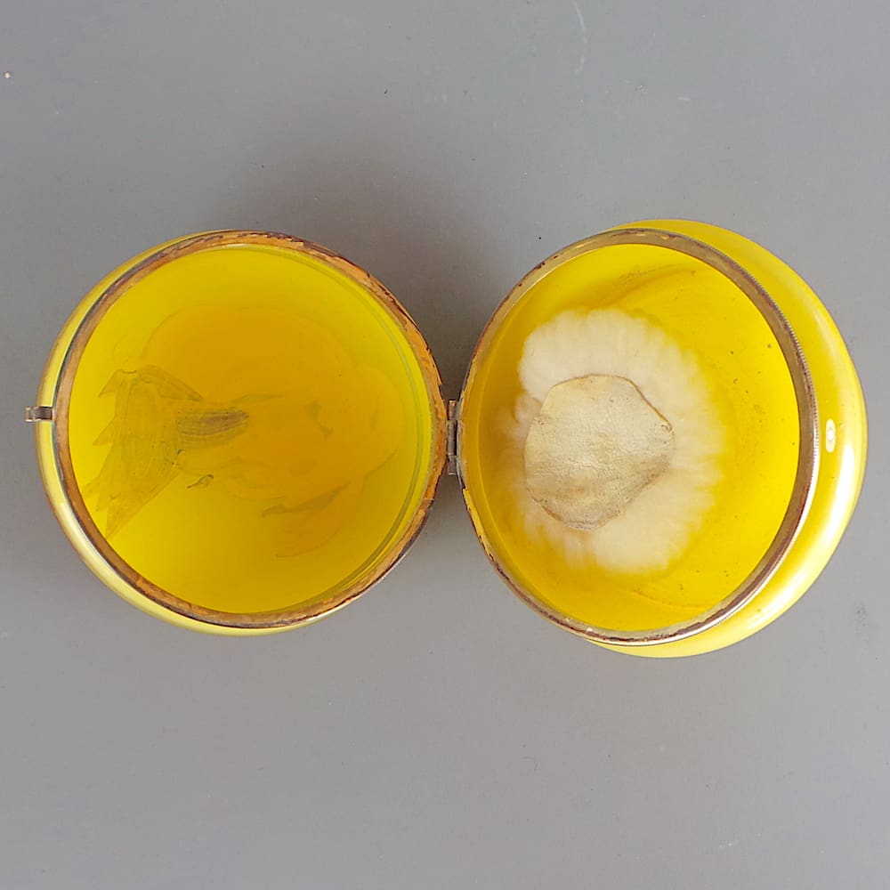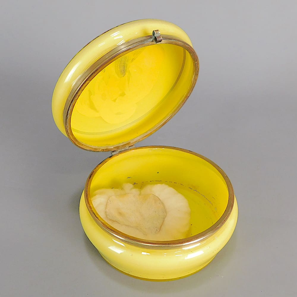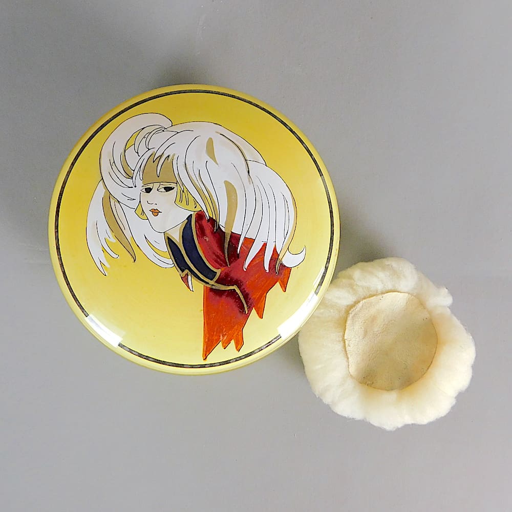 Glass lidded powder bowl with a beautiful hand painted flapper to the lid.