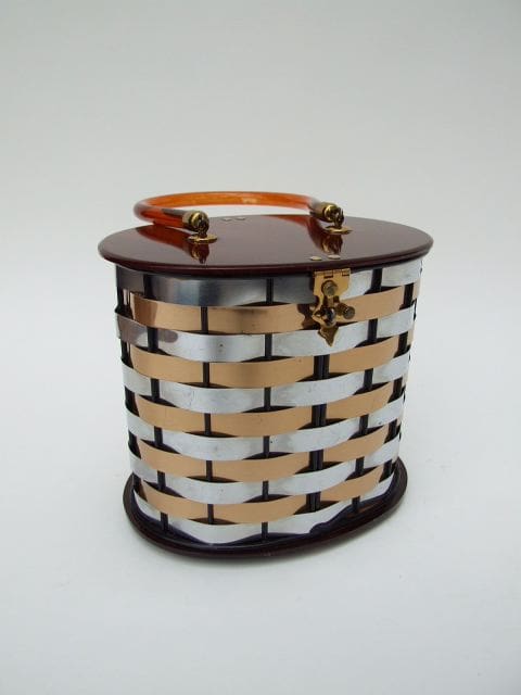 A 1950’s American basketweave bag in gold and chrome metal with lucite lid and handle. Ovular in shape. Inside it is lined in peach satin and bears the Dorset Rex label.