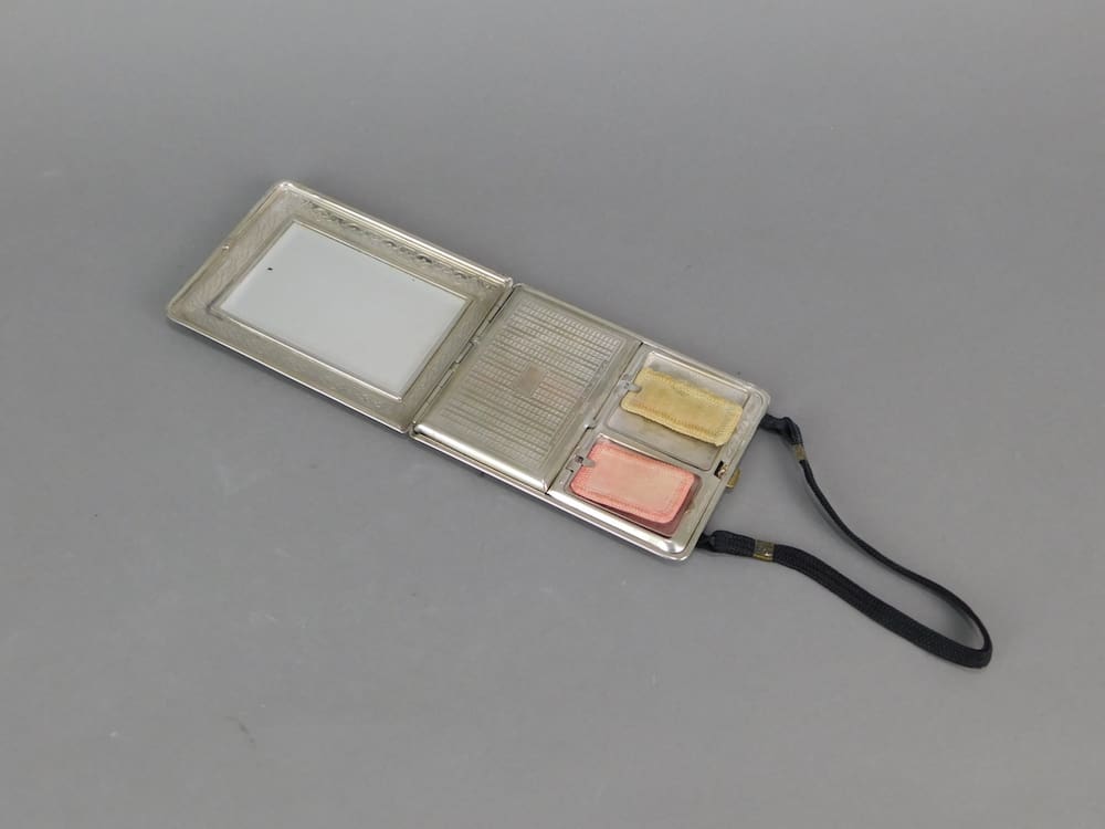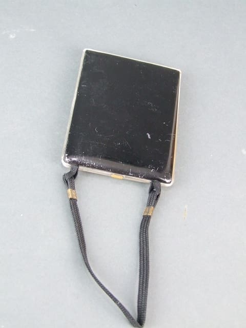 Vanity compact case with separate cigarette section, framed mirror, rouge and powder sections. Black enamel case with silver etched patterning and cord handle. Inside there is nice engine turned patterning forming a frame around the mirror.