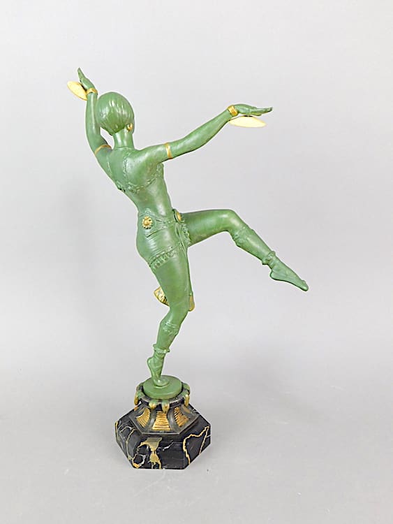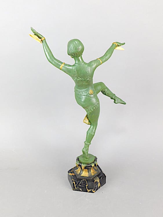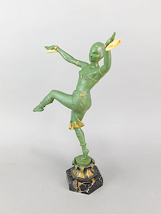 French Art Deco green patinated spelter dancer an unsigned statue by Salvadoro Voltas.