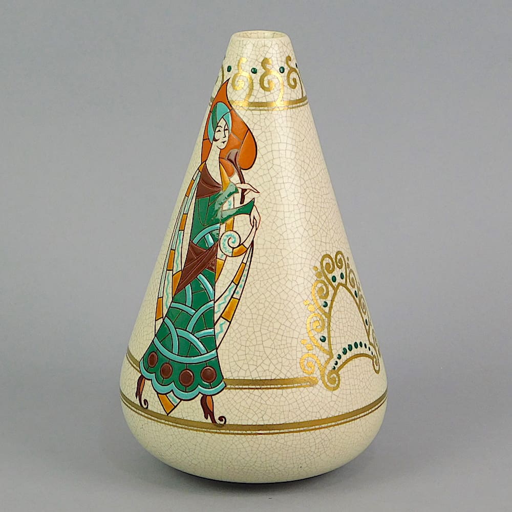 French tapered crackle glaze ceramics vase by Orchies. High enamel Harem flapper lady to the front. Hand signed under the base with Orchies windmill and signed Orchies France 203.