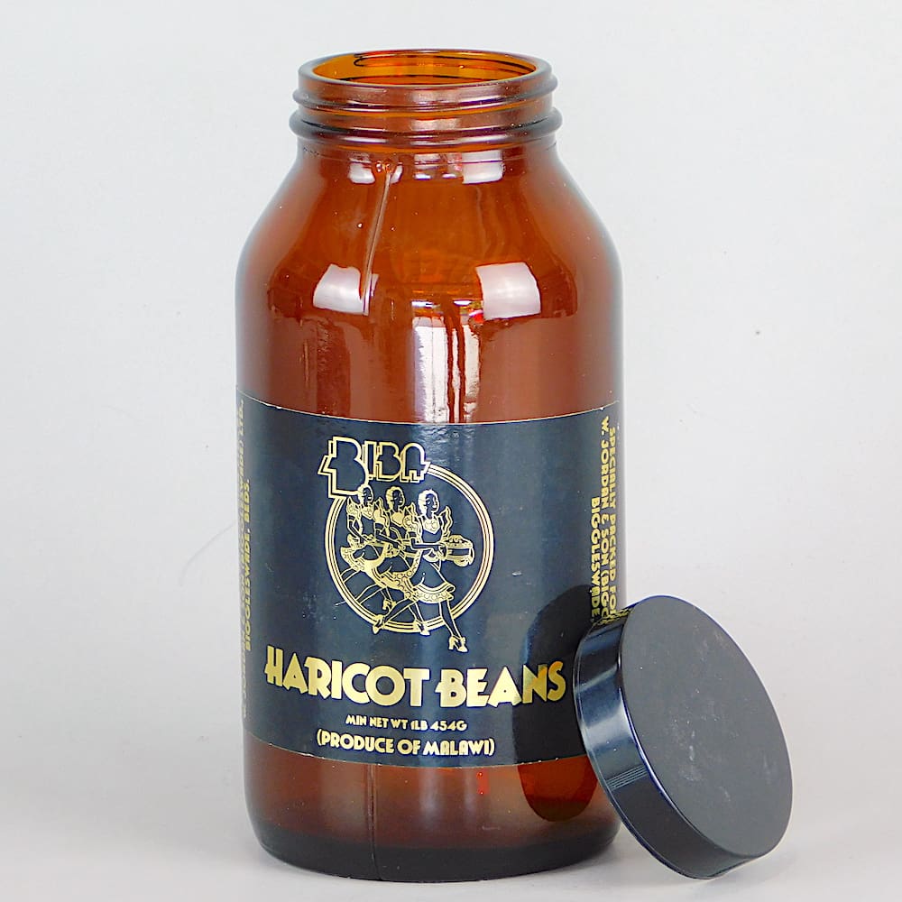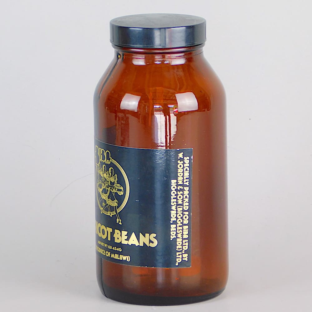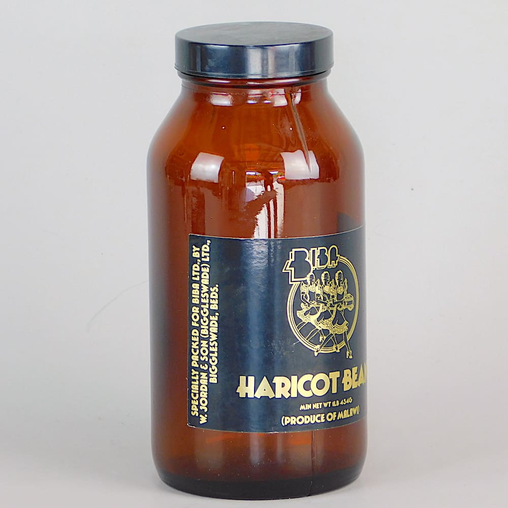 For haricot beans, in a brown glass jar.