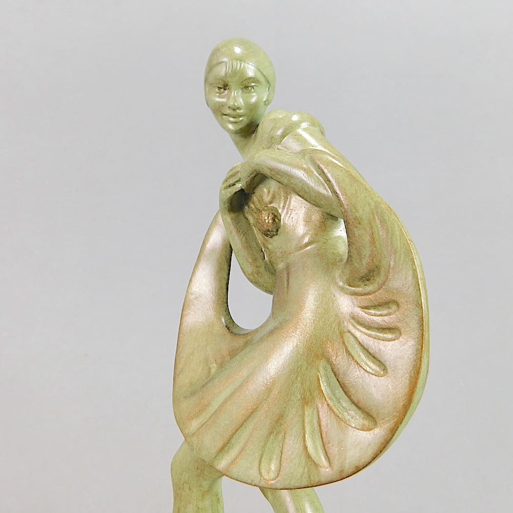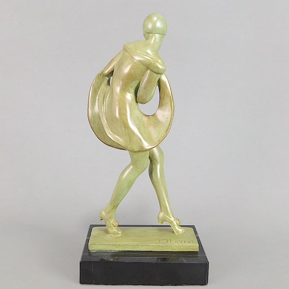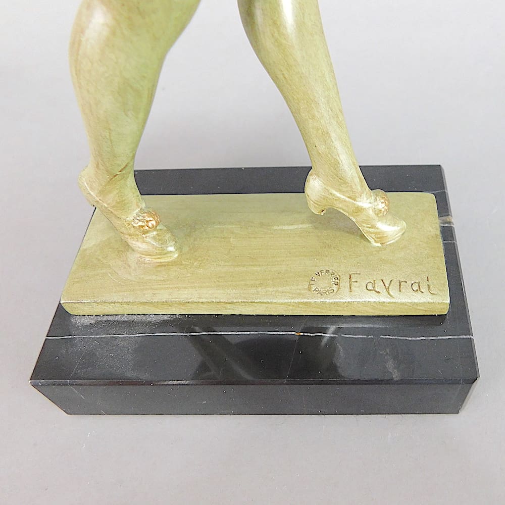 French art deco spelter statue of a Harlequin. Designed by Pierre Le Faguays using his pseudonym – Fayral which is how he signed his art metal, non-bronze pieces. Stamped to the metal socle Fayral and then raised on a Belgian black marble base.
