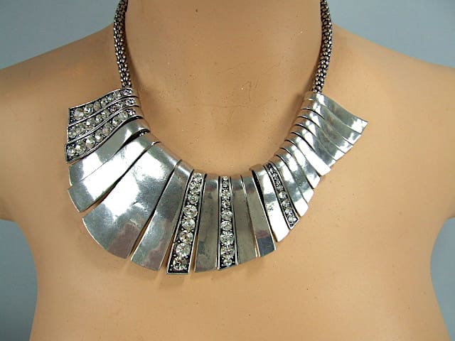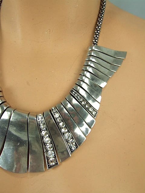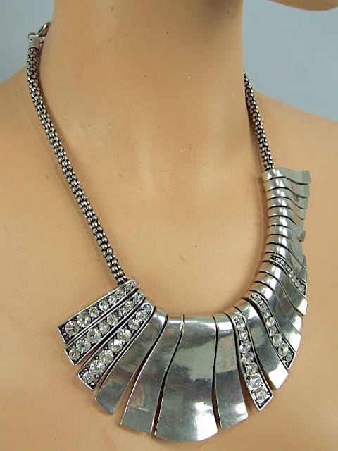 Modern large silvered metal fan necklace with large diamonte detailing. Of asymmetrical form on a snake chain and a heavy necklace.