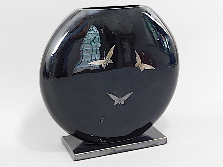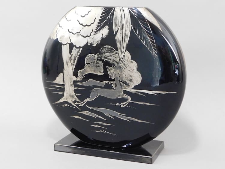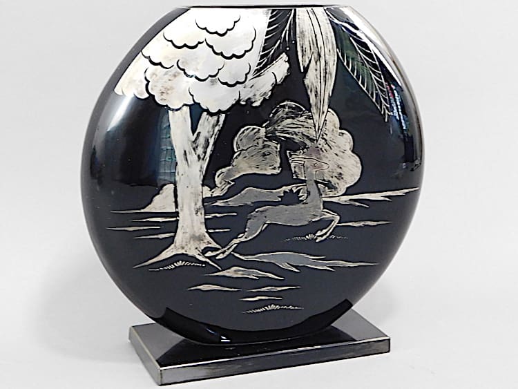 Czech art deco black glass vase with a leaping deer and tree patterning. Made by Hem and signed to the back.