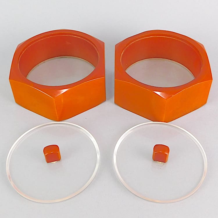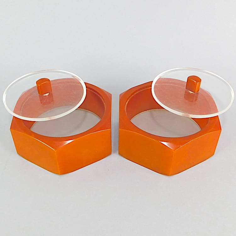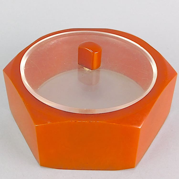 Amber phenolic and lucite hexagonal boxes. Clear lucite base and lid.