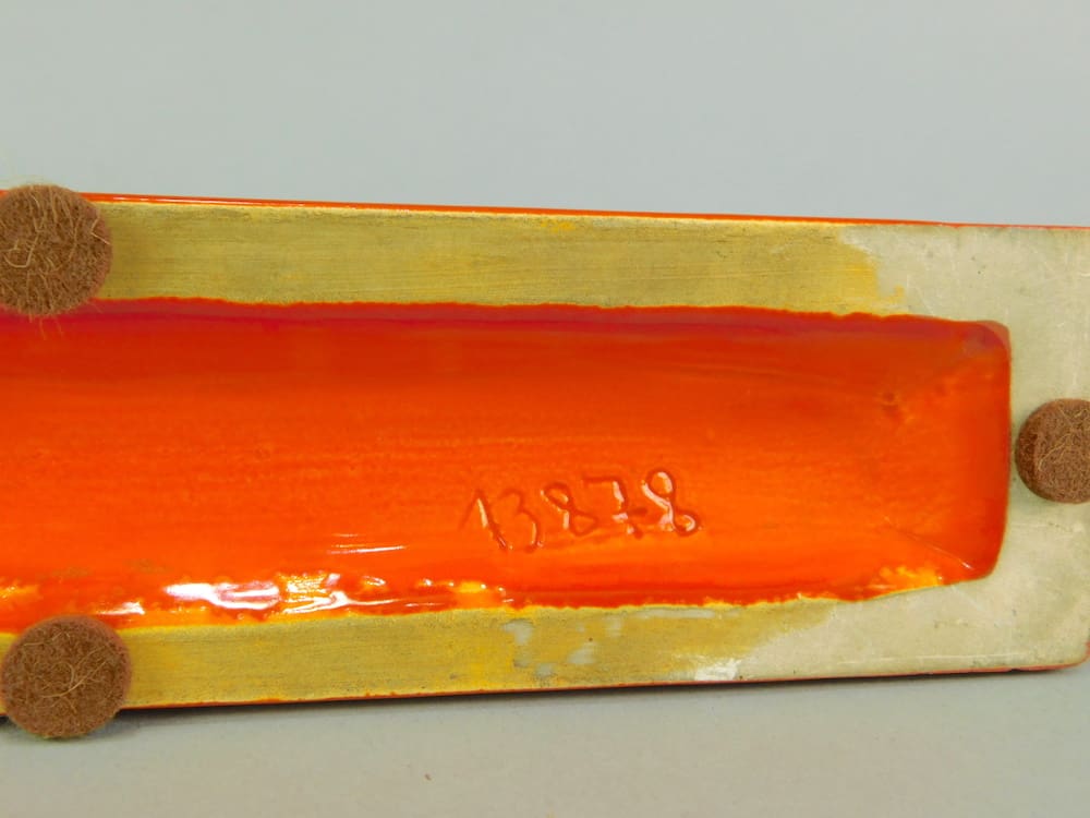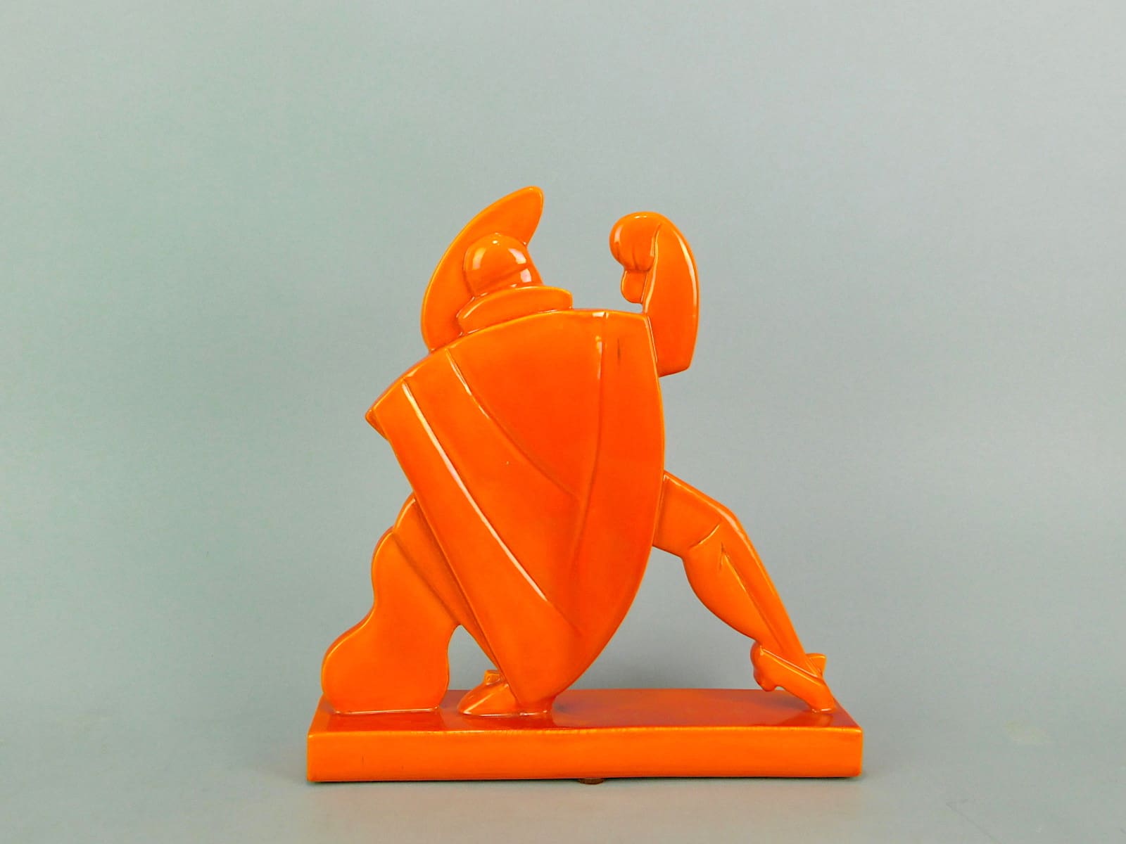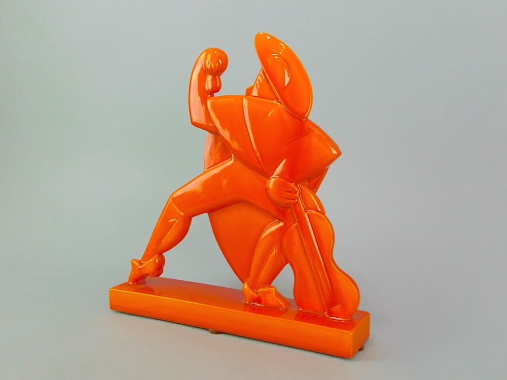 Hidalgo Ceramic Musician by Primavera. A rare art deco orange glazed earthenware stylised cubist musician with a guitar and castanets. Made by Sainte Ragedonde in 1926 for Primavera, with indistinct makers mark but visible model number.