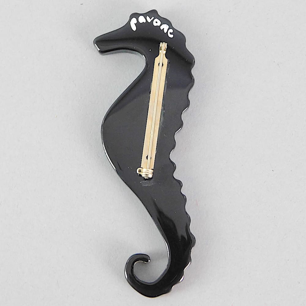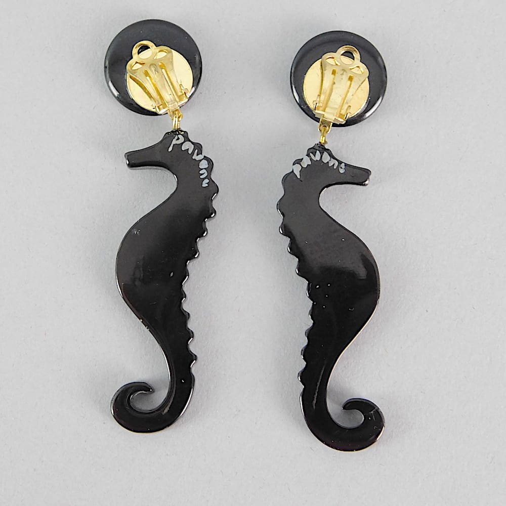 Rare French vintage galalith hand painted Seahorse brooch and clip on ear rings set.