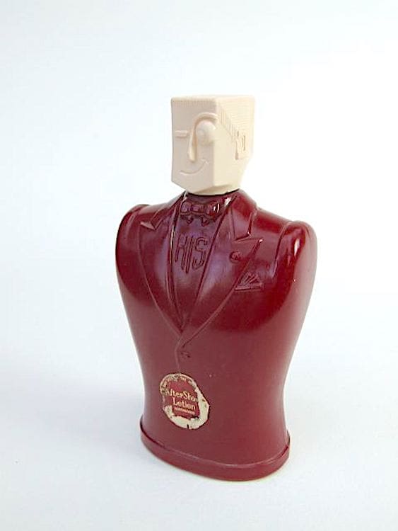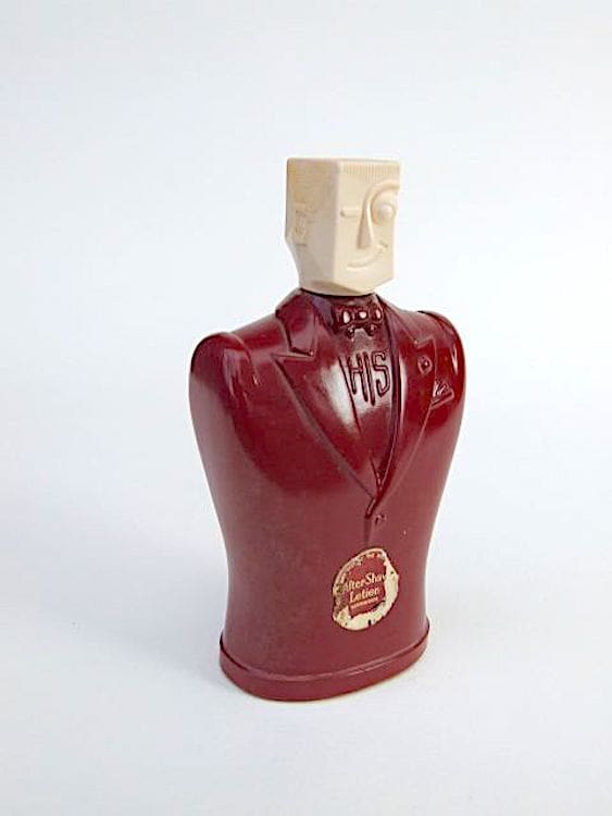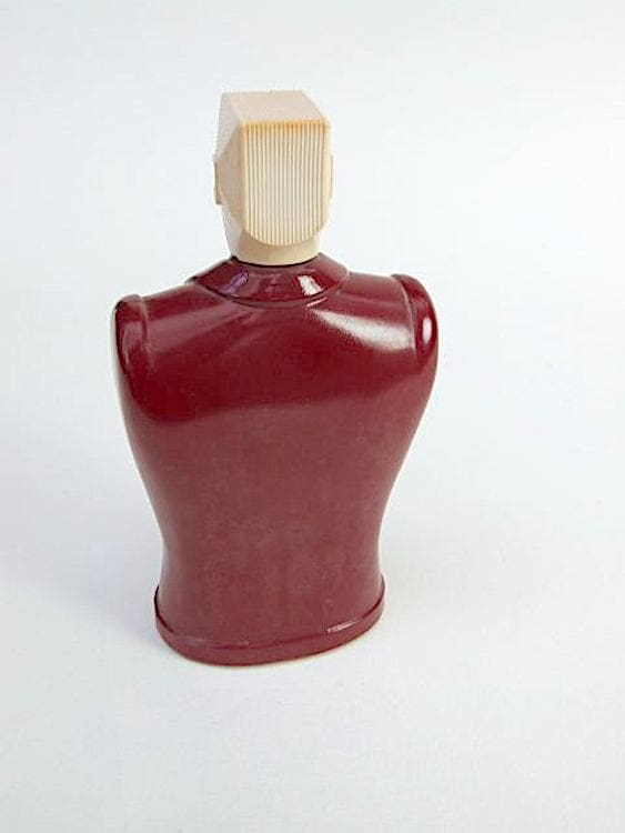 American ‘His’ Aftershave bottle, a mans body in red glass with a bakelite head and part of the original striker label to the front.