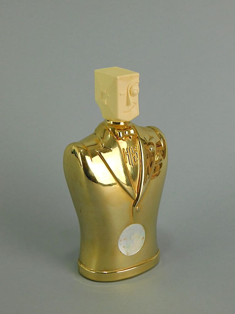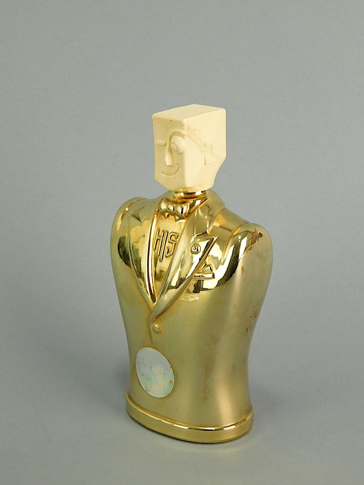 The rarer gold ‘His’ scent bottle with a lid in the form of an art deco man with a monocle on a gold glass body. Originally a man’s cologne bottle for ‘His’ perfume items. This one still retains its original label.