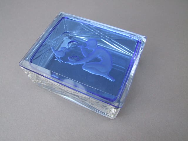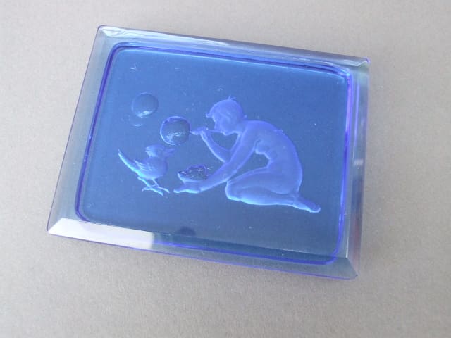 Czechoslovakian glass box with vivid blue intaglio boy blowing bubbles to the lid. This was made by Hoffman in the early 1930’s, although unsigned.