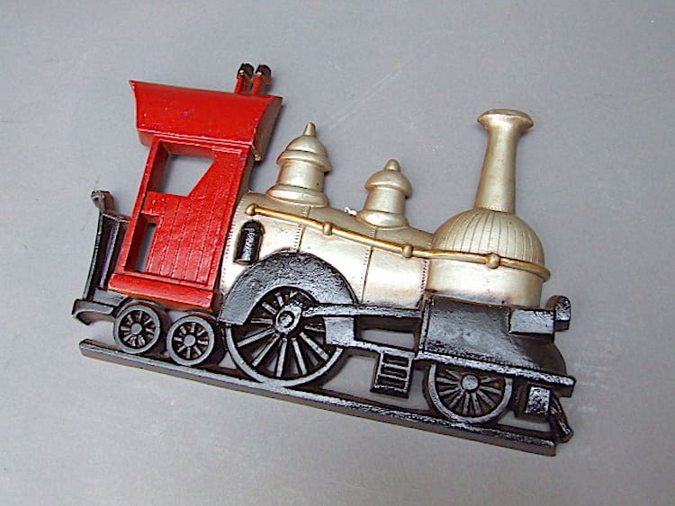American 1970’s Train plaques. Made of cast metal and date to 1975. Hand painted and has a hanging hook on the back.
