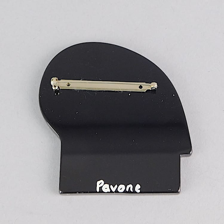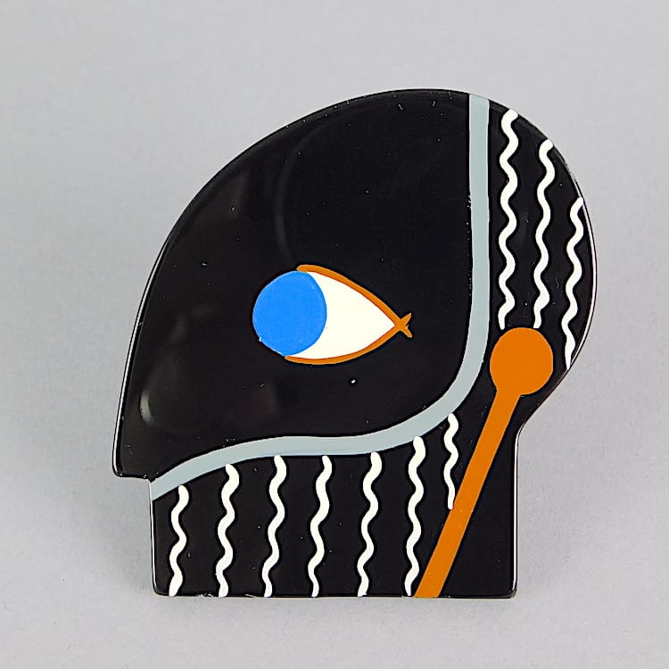 Vintage French hand made galalith art deco Tribal mans head brooch. Hand made, polished and painted by Marie-Christine Pavone. Signed to the back and fitted with a safety clasp.