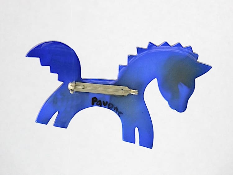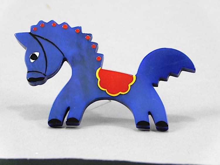 French vintage galalith hand painted art deco circus horse brooch.