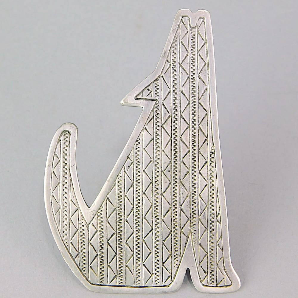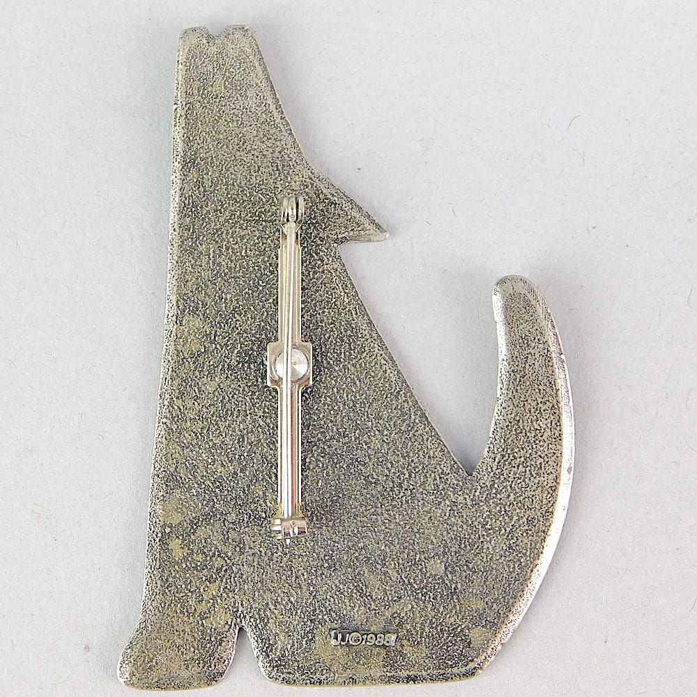 Large stylised howling wolf brooch signed JJ and dated 1988. Fitted with a roll safety clasp.