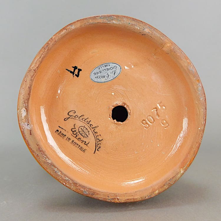 Stamped under the base Goldscheider Wien, made in Austria and bearing the model number. Information on this model can be found in the Fillip Goldscheider book on page 481.
