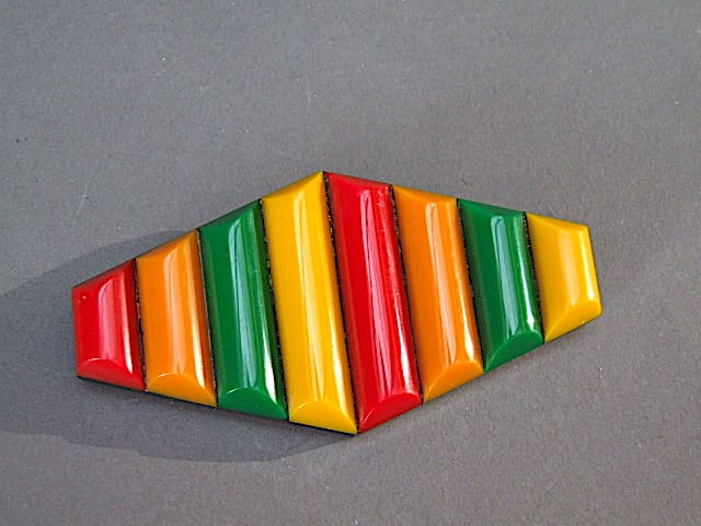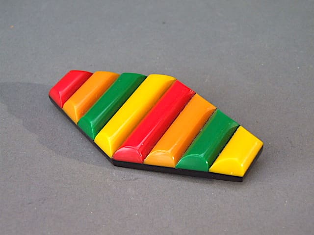 Large Philadelphia brooch, made of orange, yellow, green and red vintage phenolic material.