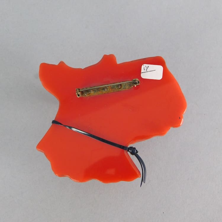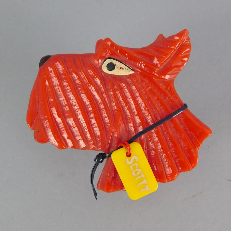 Huge hand painted vintage phenolic scotty dog brooch. He bears a tag to his collar that says Scotty. Fitted with a roll safety clasp.