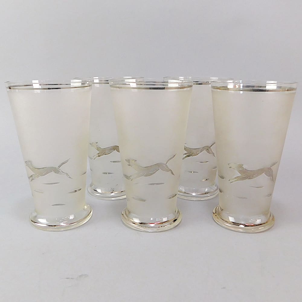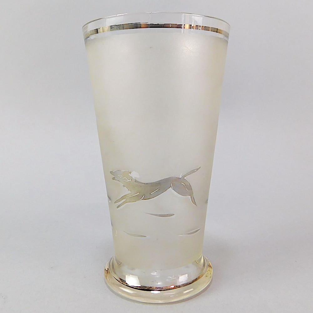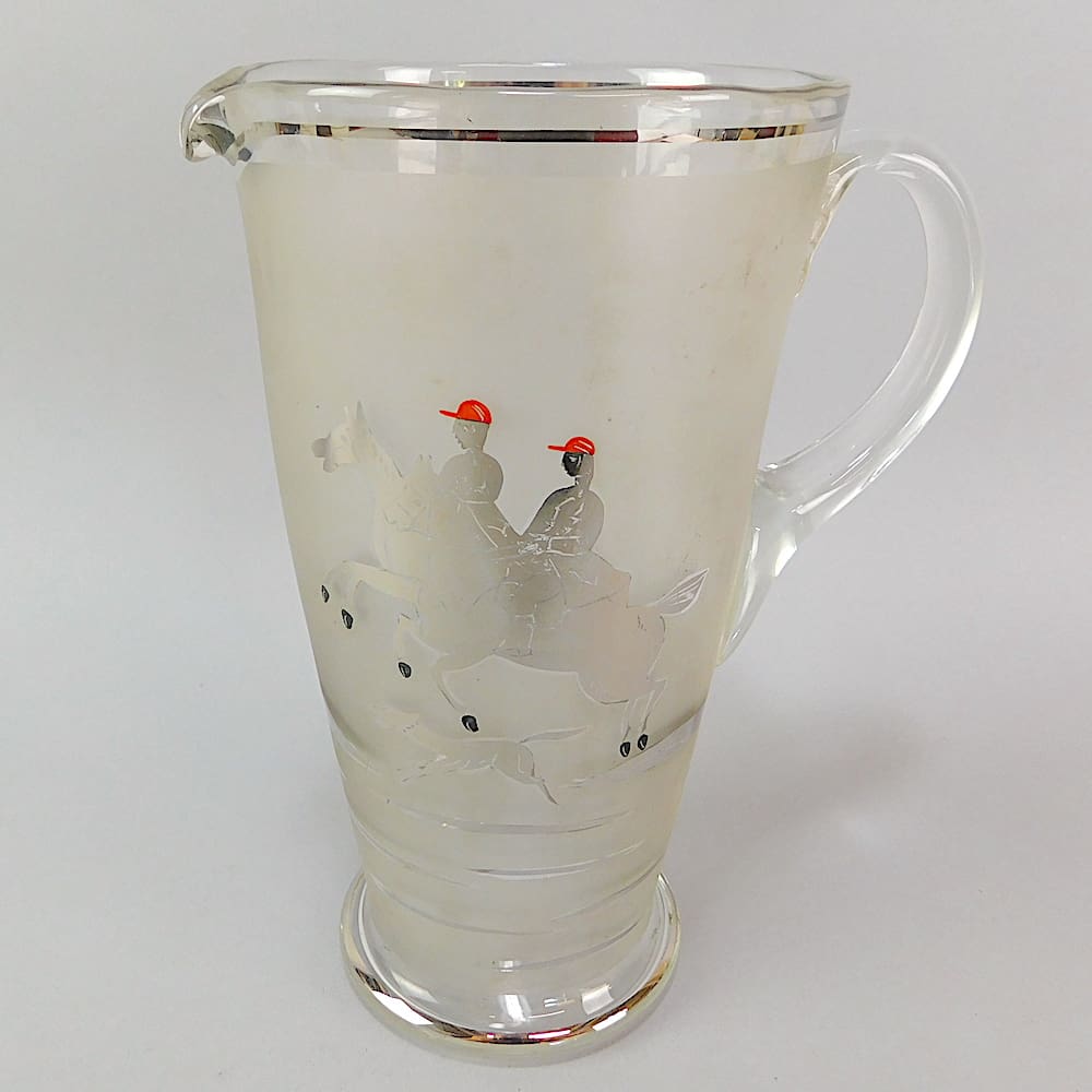 The glass is frosted with hand painted silver detail and the jug depicts 2 horse riders/hunters in red caps with a hound. The glasses each have a running hound on them.
